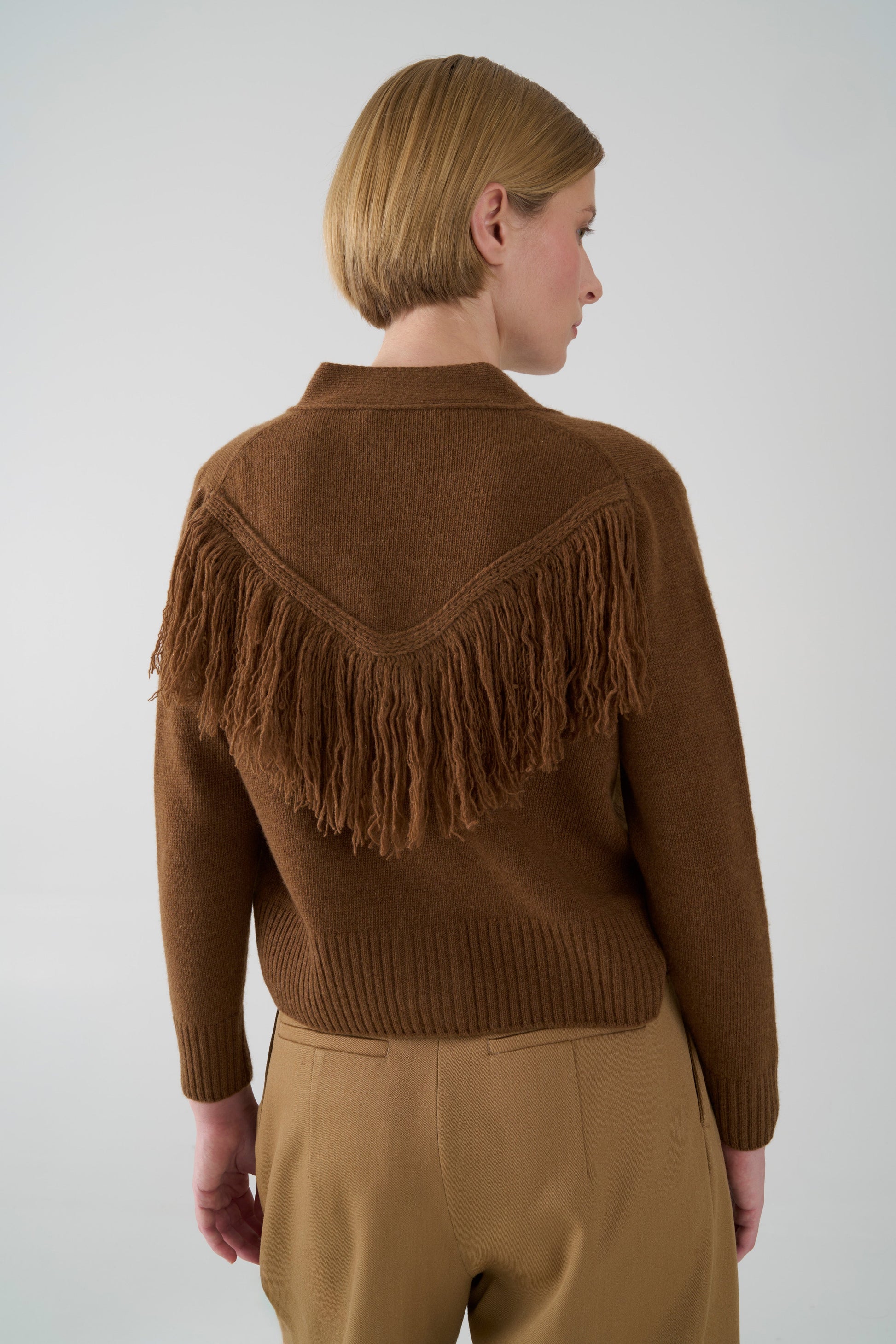 Il cardigan TM25ZE40 è la perfetta combinazione di eleganza e stile. Realizzato in 70% lana 30% cashmere, presenta una schiena decorata con frange che aggiungono un tocco di originalità. Ideale per un look sofisticato e di tendenza